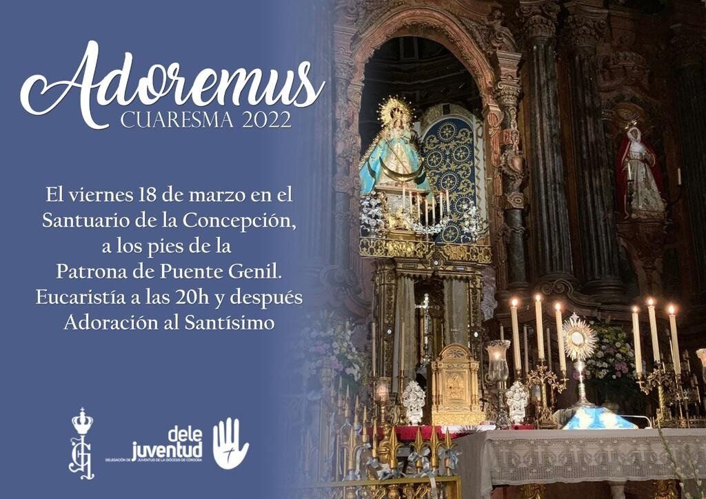 El Grupo de Jóvenes de la Pontificia y Real Cofradía de la Purísima organiza el Viernes de Cuaresma día 18 de marzo un Adoremus en Honor a Ntra. Señora de la Purísima Concepción, patrona de Puente Genil, en su Santuario. Comenzará a las 20:00 con la Eucaristía y continuará con la exposición del Santísimo. ¡Ánimo, Él te está esperando!